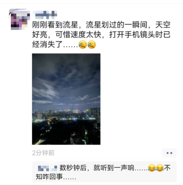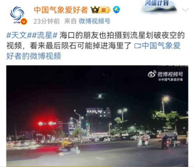 网络大V@中国气象爱好者也发布微博称,“刚刚一颗火流星划过粤西夜空。”同时还发文说海口的网友也拍摄到了这一景象。